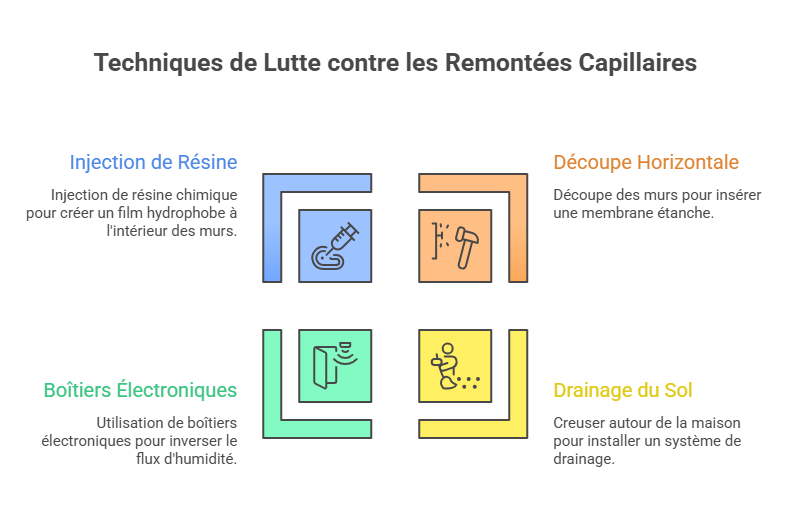 Plusieurs techniques existent pour combattre les remontées capillaires. Certaines impliquent de découper horizontalement vos murs pour y glisser une membrane étanche. D'autres consistent à creuser tout autour de votre maison pour installer un système de drainage. Il existe même des boîtiers électroniques censés inverser le flux d'humidité.